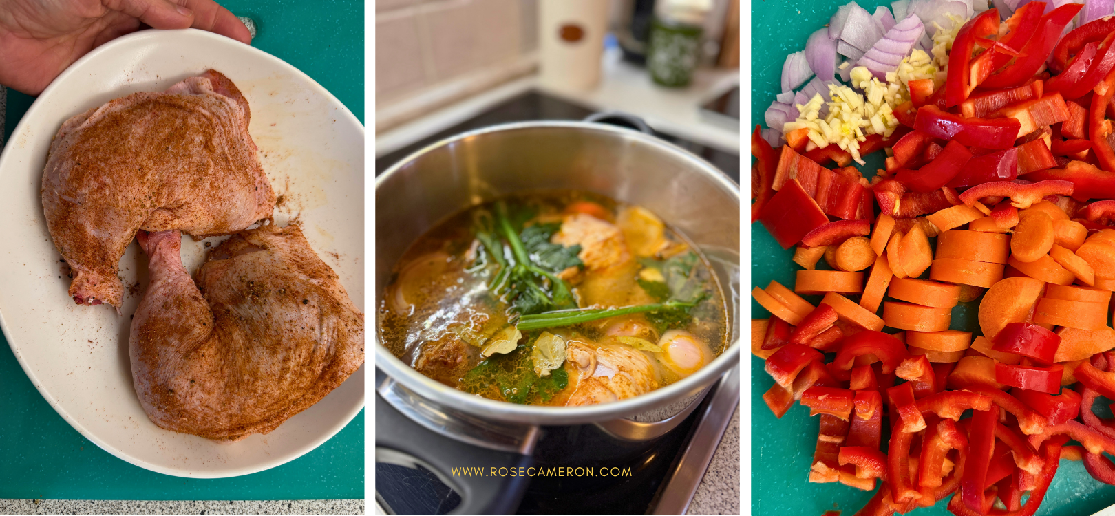 Pat dry chicken legs and season (note you can make the stock/chicken in advance!)